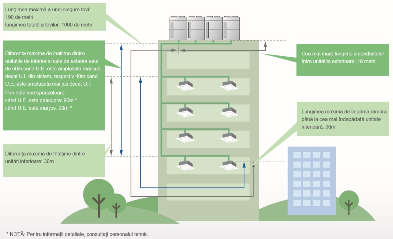 Lungime țeavă care permite diferențe de înălțime între unități de interior și exterior de până la 90 de metri *