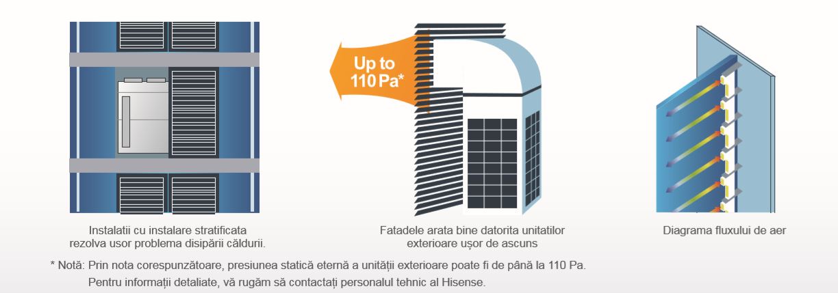 Cu tehnologia de adaptare a presiunii statice, ventilatorul unității exterioare poate fi reglat în presiune statică liberă pe baza cerințelor sistemului pentru a satisface o varietate de nevoi în medii diferite. Presiunea statică maximă externă a unității exterioare poate fi de până la 110Pa *, ceea ce asigură condiții mai bune pentru instalarea în straturi și instalarea centralizată. Presiunea statică mai mare și distanța suplimentară de alimentare cu aer a unității exterioare asigură fluxul neted al aerului și soluționează eficient problemele de condensare ale unității exterioare.