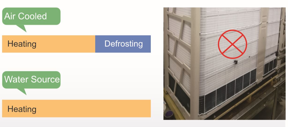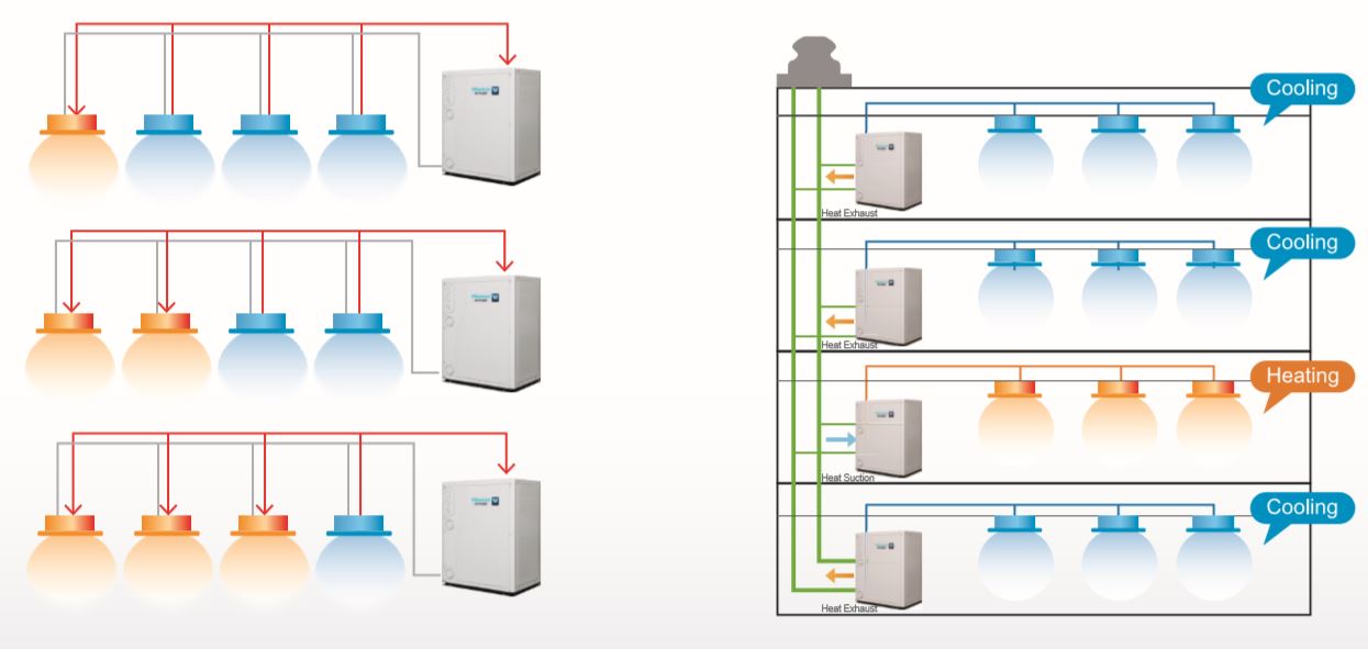 Unitatea exterioară in modul de racire disipa caldura in apa, si cealalata unitate exterioara absoarbe caldura din apa. Astfel, recuperarea căldurii între unitățile exterioare ar putea fi realizată prin conducta de apă.