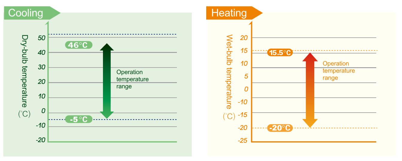 Temperatura maximă de funcționare ajunge la 46 °C * în modul de răcire, iar temperatura minimă de funcționare ajunge la -20 °C * în modul de încălzire.
