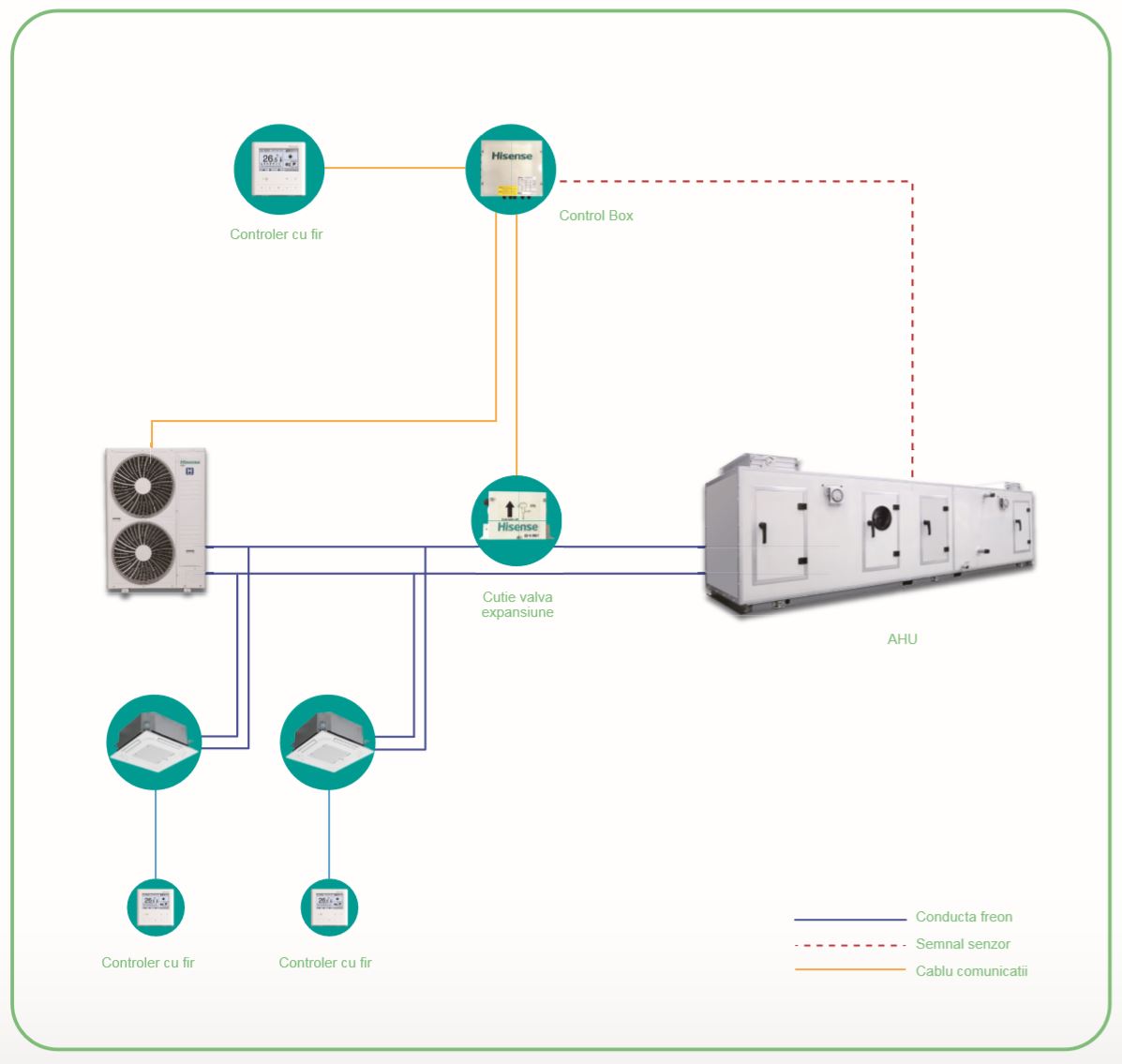 Unitățile de tratare a aerului se conectează la sistemul Hisense VRF prin sistemul AHU-KIT, care poate oferi soluții mai flexibile de aer condiționat și de reducere a costurilor.
